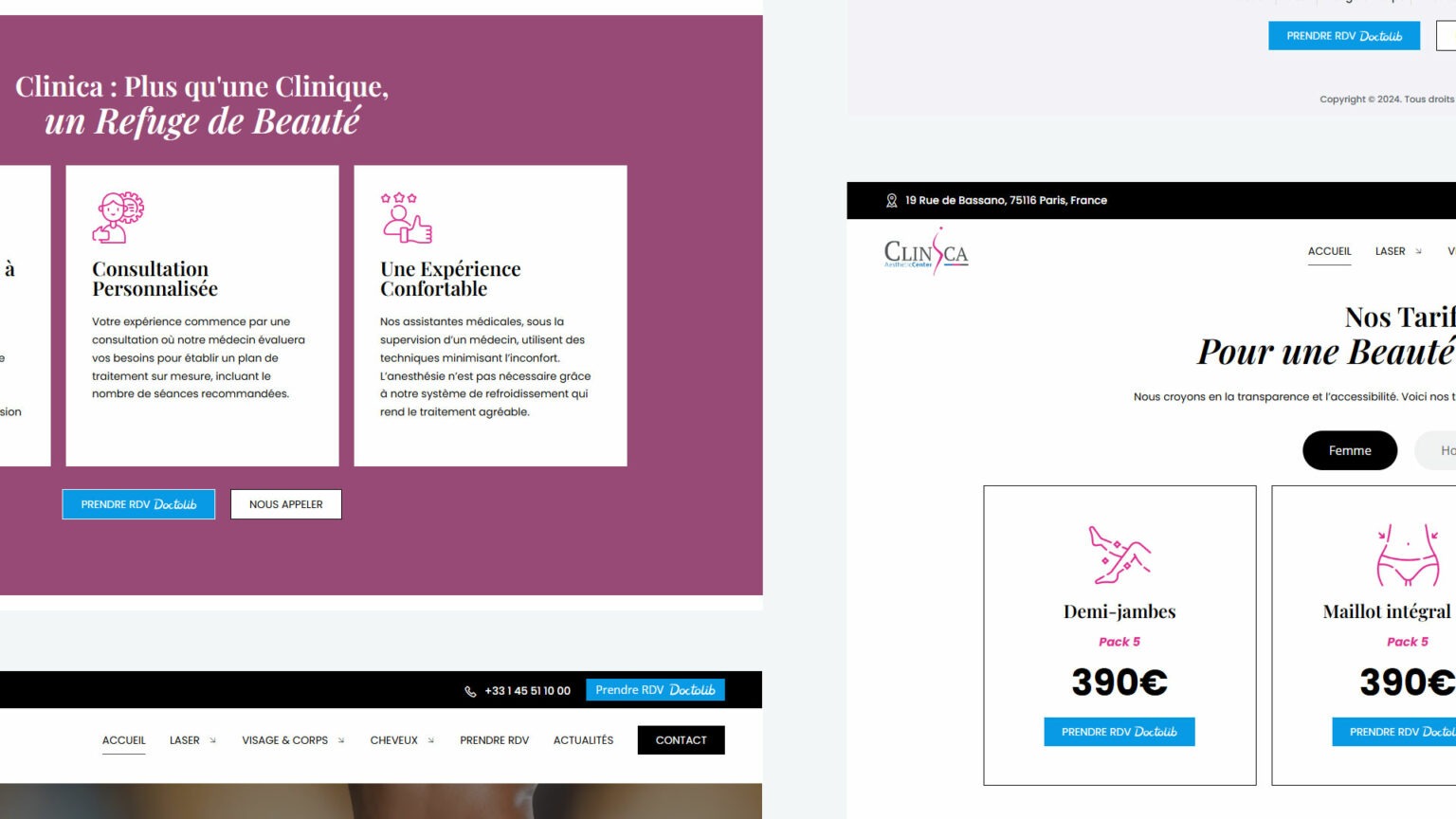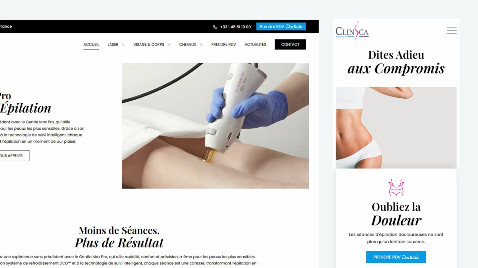 Clinica est un centre esthétique haut de gamme proposant des soins médicaux et chirurgicaux à Paris. Leur site manquait d’harmonie visuelle, d’ergonomie et de fluidité. La landing page principale ne permettait ni une bonne réassurance, ni une compréhension claire de l’offre dès l’arrivée sur le site.